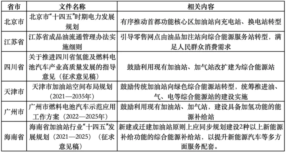 新能源汽車成為交通領(lǐng)域落實(shí)“雙碳”戰(zhàn)略和保障國家能源安全的重要抓手,國家發(fā)展改革委、國家能源局《關(guān)于完善能源綠色低碳轉(zhuǎn)型體制機(jī)制和政策措施的意見》《關(guān)于加快推進(jìn)充電基礎(chǔ)設(shè)施建設(shè) 更好支持新能源汽車下鄉(xiāng)和鄉(xiāng)村振興的實(shí)施意見》等文件及北京、江蘇、四川、天津、廣州等地,均鼓勵傳統(tǒng)加油站、加氣站建設(shè)綜合能源站。同時,北京市發(fā)布《北京市加油站設(shè)置新能源設(shè)施安全生產(chǎn)管理工作指引》,率先明確加油站設(shè)置充換電設(shè)施的安全技術(shù)要求。