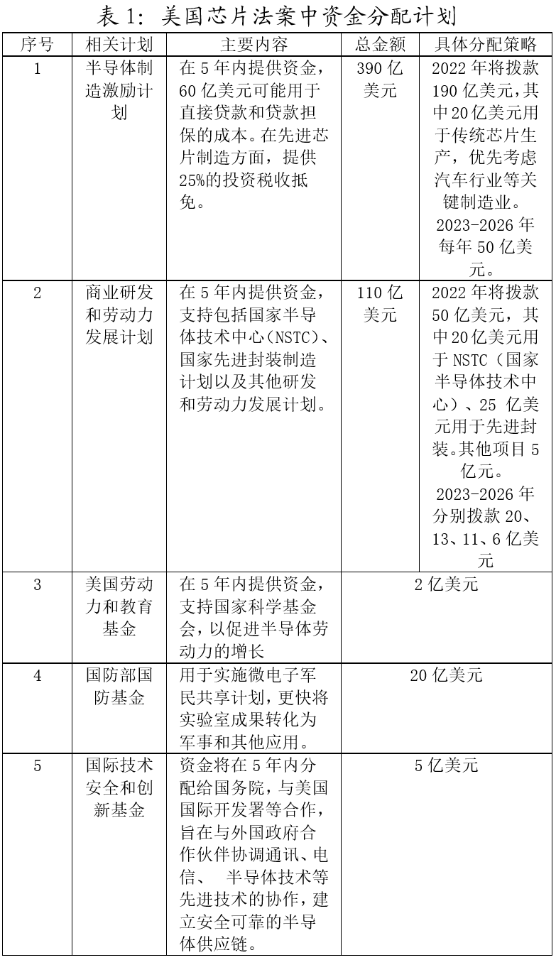 表1:美國芯片法案中資金分配計(jì)劃
