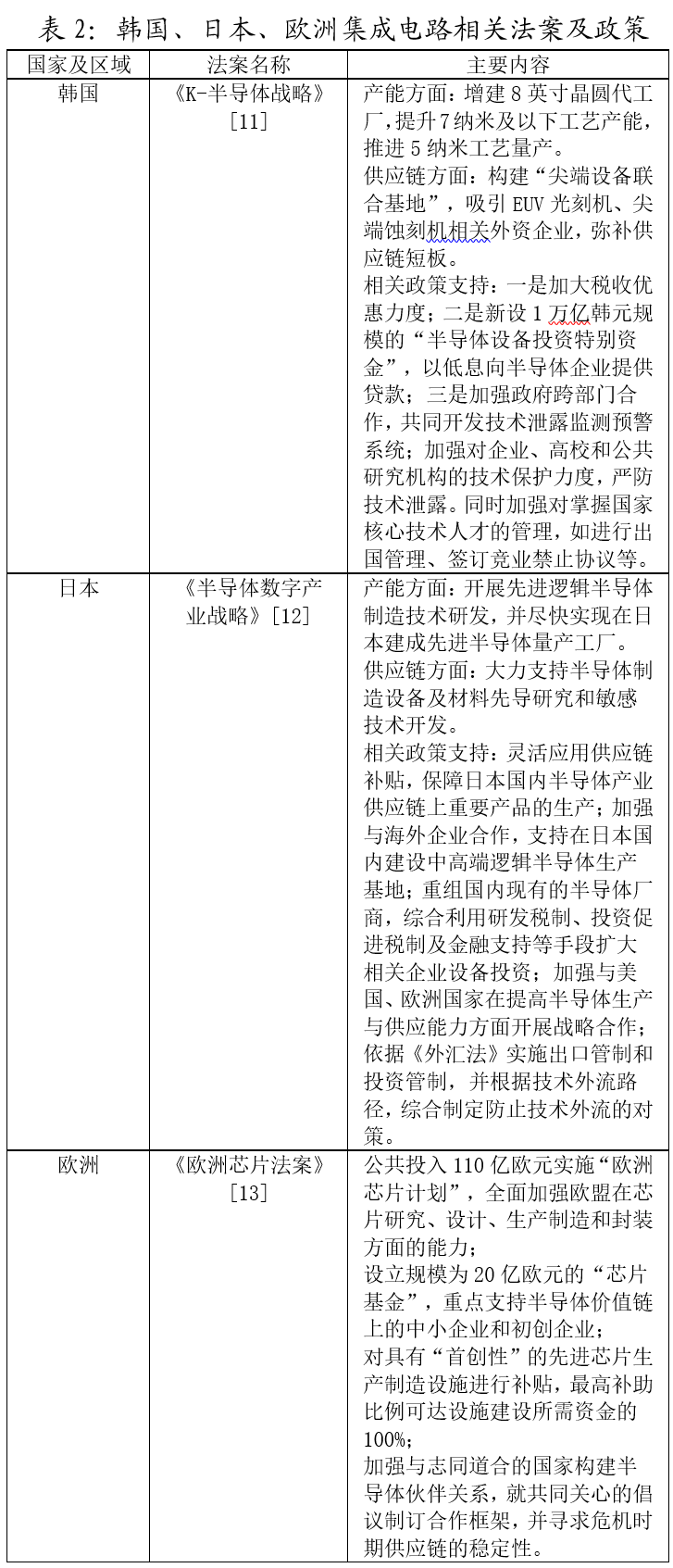 《2022芯片與科學(xué)法》出臺(tái)前,韓國政府于2021年5月發(fā)布《K-半導(dǎo)體戰(zhàn)略》[11],以“打造世界最強(qiáng)的半導(dǎo)體供應(yīng)鏈”為愿景,圍繞構(gòu)建“K-半導(dǎo)體產(chǎn)業(yè)帶”、加大半導(dǎo)體基礎(chǔ)設(shè)施建設(shè)、夯實(shí)半導(dǎo)體技術(shù)發(fā)展基礎(chǔ)、提升半導(dǎo)體產(chǎn)業(yè)危機(jī)應(yīng)對能力四大方面制定了16項(xiàng)推進(jìn)課題,提出到2030年將半導(dǎo)體年出口額增加到2000億美元,并將相關(guān)就業(yè)崗位增至27萬個(gè),并且由國會(huì)及相關(guān)部門就是否制定《半導(dǎo)體特別法》及立法方向進(jìn)行協(xié)商,立法方向包括但不限于:人才培養(yǎng)、基礎(chǔ)設(shè)施支持、投資支持、研發(fā)加速化方案等。日本政府緊接著在2021年6月對半導(dǎo)體、數(shù)字基礎(chǔ)設(shè)施及數(shù)字產(chǎn)業(yè)做出綜合部署,制定了以擴(kuò)大國內(nèi)半導(dǎo)體生產(chǎn)能力為目標(biāo)的《半導(dǎo)體數(shù)字產(chǎn)業(yè)戰(zhàn)略》[12]。歐洲于2022年2月出臺(tái)《歐洲芯片法案》[13]提出將在2030年前充分調(diào)動(dòng)公共和私營部門資金,投入430億歐元(約合3000億人民幣)構(gòu)建起繁榮的生態(tài)系統(tǒng),確保歐盟在半導(dǎo)體領(lǐng)域的領(lǐng)先地位。先進(jìn)國家將上述政策以法案的形式推出,體現(xiàn)出美歐等國將支持集成電路產(chǎn)業(yè)發(fā)展作為一個(gè)長期的,既定的目標(biāo)來執(zhí)行,并且一定程度上確保了其產(chǎn)業(yè)扶持政策的延續(xù)性。這將使得大量資金、關(guān)鍵人才和企業(yè)熱衷于向美國、歐洲等先進(jìn)國家轉(zhuǎn)移,削弱我國獲取國際產(chǎn)業(yè)資源和創(chuàng)新要素的能力;同時(shí),幾乎所有先進(jìn)國家新推行的集成電路領(lǐng)域相關(guān)法案或政策,都對加大技術(shù)出口管制有明確規(guī)定,這使得國際企業(yè)在我國的技術(shù)溢出和人才培養(yǎng)貢獻(xiàn)將會(huì)減小,長期以來我國依靠“外源式”創(chuàng)新獲得的技術(shù)提升機(jī)會(huì)將會(huì)大打折扣,從而在集成電路關(guān)鍵領(lǐng)域?qū)崿F(xiàn)追趕的阻礙將顯著加大。