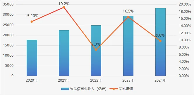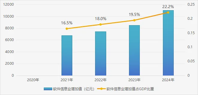 “十四五”以來,北京信息軟件業(yè)保持高速增長,成為全市經(jīng)濟(jì)高質(zhì)量發(fā)展的核心支撐。2021年北京信息軟件業(yè)1實(shí)現(xiàn)收入2.2萬億元,2024年收入突破3.3萬億元,僅用三年時(shí)間再邁上一個(gè)萬億級(jí)臺(tái)階,占全國信息軟件業(yè)比重近四分之一。2024年,北京信息軟件業(yè)實(shí)現(xiàn)增加值11068.8億元,同比增長11.0%,占地區(qū)生產(chǎn)總值的22.2%,成為全市經(jīng)濟(jì)的第一支柱。