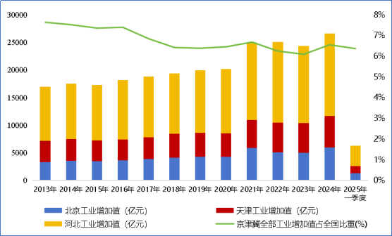 圖2 2013-2025年一季度京津冀地區(qū)全部工業(yè)增加值變化及全國占比情況