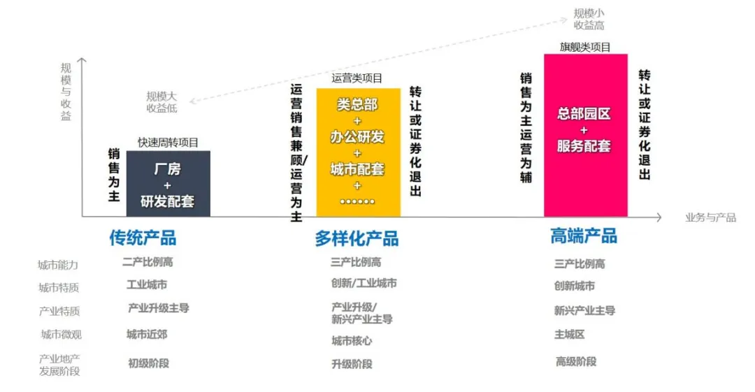 產業(yè)地產的產品定位要結合城市進入策略、產業(yè)定位策略進行系統(tǒng)性分析,可以根據不同的城市特征、城市性質、產業(yè)性質、城市微觀和發(fā)展階段,形成三大類產品:第一類是傳統(tǒng)產品,包括工業(yè)廠房+研發(fā)配套等業(yè)態(tài),實施快速周轉的運營策略;第二類是多樣化的產品,主要包括類總部、研發(fā)辦公、配套服務等業(yè)態(tài),實施運營銷售兼顧的策略,最終通過整體出售、轉讓或出租運營REITs實現項目退出;第三類是旗艦類產品,主打核心地段高端產品,主要包括總部經濟、研發(fā)辦公、配套服務等業(yè)態(tài),實施銷售為主運營為輔的策略,最終通過整體銷售等形式實現項目退出。