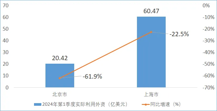 當前,地緣政治沖突加劇,大國經(jīng)濟增長承壓,各類風險因素疊加,導致全球資金包括直接投資的流動放緩,2024年1季度,全國實際利用外資金額3016.7億元人民幣,同比下降26.1%,與2023年第四季度比,環(huán)比增長41.7%。在國家整體大背景下,今年1季度,北京市新設外資企業(yè)417家,比上年增長19.1%,實際利用外商直接投資20.42億美元,同比下降61.9%;上海市新設外商投資企業(yè)1340家,比去年同期增長16%,實際利用外資金額為60.47億美元,比去年同期下降22.5%。