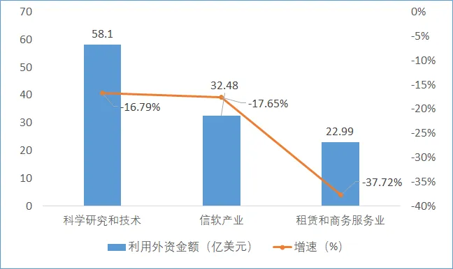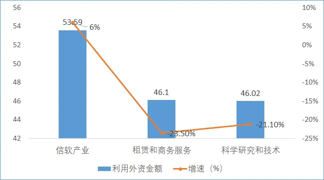 2023年,北京市實際利用外資金額排名前三的行業(yè)分別為科學研究和技術服務業(yè),信息傳輸、軟件和信息技術服務業(yè),租賃和商務服務業(yè),實際利用外資金額分別為58.1億美元、32.48億美元和22.99億美元,合計占比為82.8%,增速分別為-16.79%、-17.65%和-37.72%;上海市實際利用外資金額排名前三的行業(yè)分別為信息傳輸軟件和信息技術服務業(yè)、租賃和商務服務業(yè)、科學研究和技術服務業(yè),實際利用外資金額分別為53.59億美元、46.1億美元和46.02億美元,合計占比為60.5%,增速分別為6%、-23.5%和-21.1%。