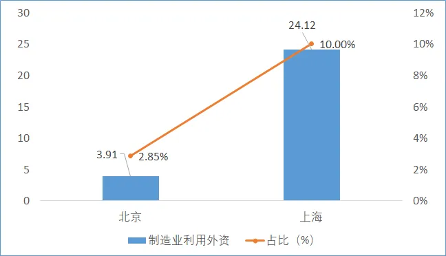 圖6 2023年北京市和上海市制造業(yè)利用外資(億美元)及占比