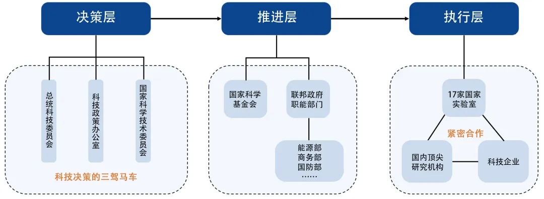 美國(guó)政府及人工智能發(fā)展推進(jìn)機(jī)構(gòu)分為決策層、推進(jìn)層和執(zhí)行層。決策層承擔(dān)提出政策建議、決定政策方向的任務(wù),包括總統(tǒng)科技顧問(wèn)委員會(huì)(PCAST)、科技政策辦公室(OSTP)和國(guó)家科學(xué)技術(shù)委員會(huì)(NSTC),這三個(gè)機(jī)構(gòu)被稱(chēng)為聯(lián)邦政府科技決策的“三駕馬車(chē)”。推進(jìn)層負(fù)責(zé)落實(shí)政策、推進(jìn)項(xiàng)目,以能源部、商務(wù)部等職能部門(mén)以及美國(guó)國(guó)家科學(xué)基金會(huì)(NSF)為核心。執(zhí)行層主要由能源部管轄的17家國(guó)家實(shí)驗(yàn)室構(gòu)成,將研究資源輸送到人工智能各細(xì)分領(lǐng)域,與頂尖高校等研究機(jī)構(gòu)和前沿科技企業(yè)合作共同開(kāi)展前沿科研工作。