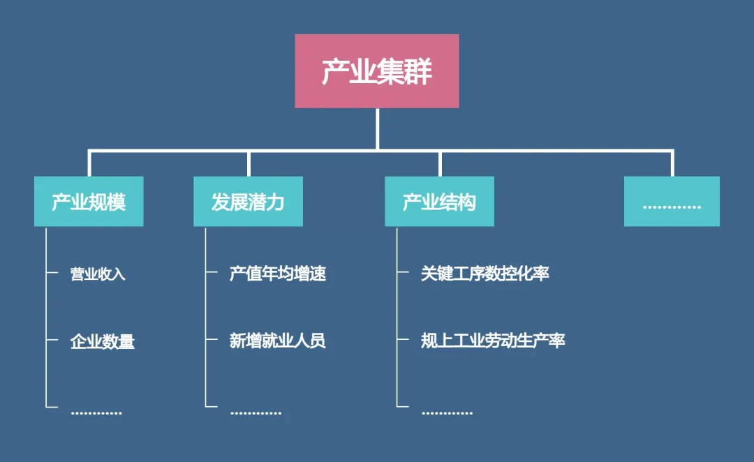 本文揀選一個(gè)一級(jí)指標(biāo)下設(shè)若干二三級(jí)指標(biāo)的評(píng)估指標(biāo)體系為示例,三類(lèi)評(píng)估框架體系均可在上述指標(biāo)基礎(chǔ)上進(jìn)行靈活調(diào)整。要點(diǎn)式評(píng)估體系聚焦核心關(guān)注點(diǎn)調(diào)整一二三級(jí)指標(biāo),如階段性主要關(guān)注產(chǎn)業(yè)規(guī)模時(shí),可在行文分析時(shí)多著墨于產(chǎn)業(yè)營(yíng)收規(guī)模、企業(yè)數(shù)量等情況,以凸顯成效或問(wèn)題;賦分式評(píng)估體系適當(dāng)對(duì)指標(biāo)進(jìn)行權(quán)重賦分,如設(shè)定產(chǎn)業(yè)集群在總體指標(biāo)體系中權(quán)重為30%,可細(xì)化分解權(quán)重為產(chǎn)業(yè)規(guī)模10%、發(fā)展?jié)摿?0%、產(chǎn)業(yè)結(jié)構(gòu)10%,依此類(lèi)推設(shè)定三級(jí)指標(biāo)權(quán)重;指數(shù)式評(píng)估體系可利用指標(biāo)體系某一維度或總體評(píng)分結(jié)果等作為基準(zhǔn)值進(jìn)行綜合測(cè)算,如對(duì)2020-2023年產(chǎn)業(yè)集群變化情況進(jìn)行指數(shù)化分析,可先依托賦分式指標(biāo)體系計(jì)算出2020年得分,并將其作為基準(zhǔn)值對(duì)應(yīng)指數(shù)“1”,2021-2023年得分各自與2020年得分之比乘以“1”,結(jié)果便可作為各年度產(chǎn)業(yè)集群指數(shù)。