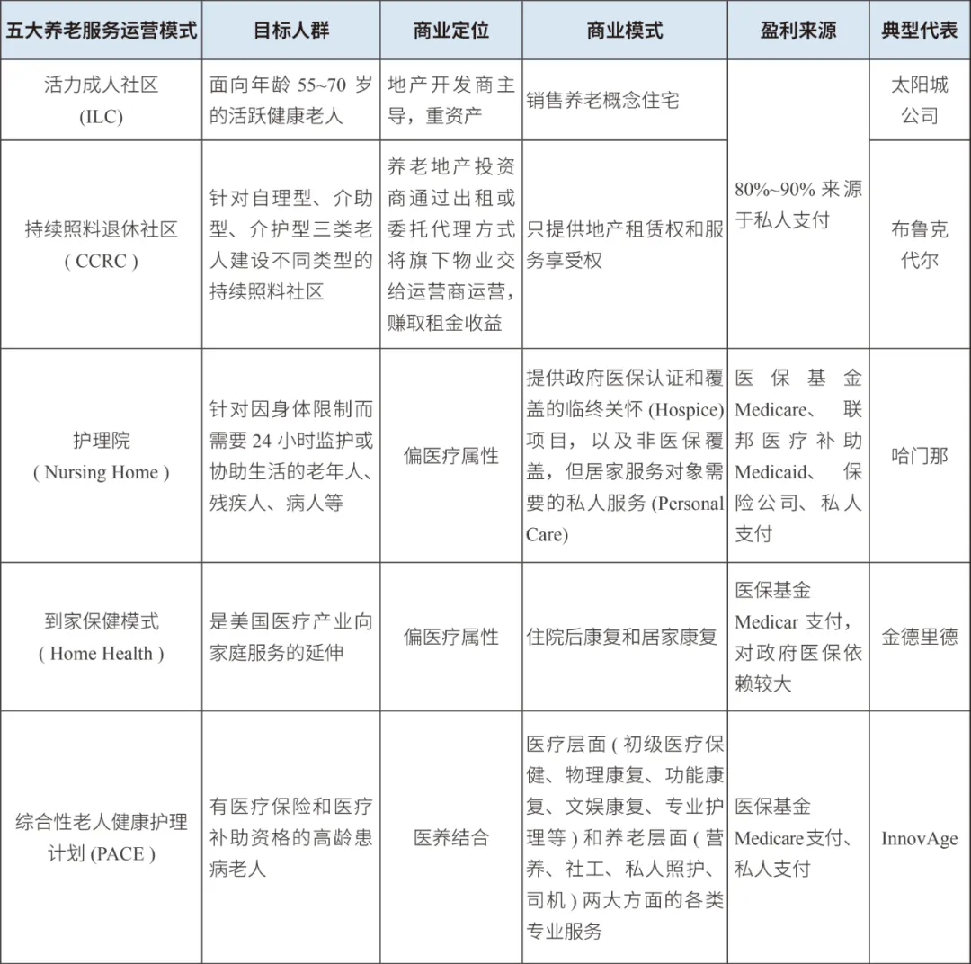 美國(guó)的養(yǎng)老服務(wù)模式中,機(jī)構(gòu)模式出現(xiàn)最早,商業(yè)化程度高,但后續(xù)出現(xiàn)的基于社保的社區(qū)和居家模式也日益受到青睞。機(jī)構(gòu)模式以獨(dú)立養(yǎng)老社區(qū)為主,商業(yè)化運(yùn)作,提供活力成人社區(qū)(ILC)、持續(xù)照料退休社區(qū)(CCRC)等多元化養(yǎng)老場(chǎng)景,滿足不同護(hù)理服務(wù)需求。養(yǎng)老社區(qū)通常由地產(chǎn)開發(fā)商、專業(yè)養(yǎng)老地產(chǎn)運(yùn)營(yíng)商參與運(yùn)營(yíng),以成立投資信托基金的方式減輕總資產(chǎn)模式下前期資金投入以及后期運(yùn)營(yíng)的壓力,已形成了完整的融資、建設(shè)、運(yùn)營(yíng)專業(yè)體系。