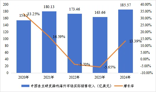 圖 1 近五年中國自主研發(fā)游戲海外市場實際銷售收入及增速