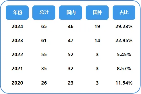 2024年共65款創(chuàng)新醫(yī)療器械產(chǎn)品上市(詳表附后),同比增長6.6%,獲批數(shù)量為2014年以來的歷史新高。從數(shù)量上看,美國直覺外科公司獲批產(chǎn)品數(shù)量最多,系歷年首次有國外企業(yè)獲此“殊榮”,其共獲批5款產(chǎn)品,均為支氣管導(dǎo)航操作系統(tǒng)部件。其次為北京品馳醫(yī)療,共有4款產(chǎn)品獲批,包括植入式腦深部電刺激電極導(dǎo)線套件等創(chuàng)新產(chǎn)品。
