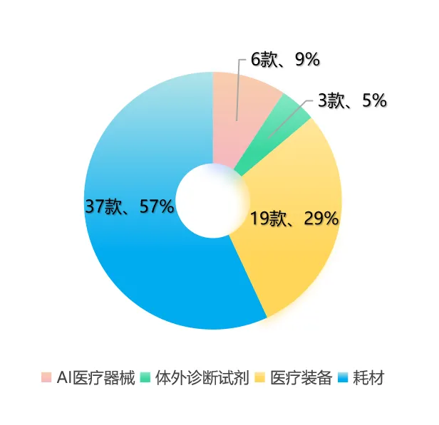 高端植介入耗材產(chǎn)品發(fā)展強勁,占比大幅提升,從去年的46%增加到了57%。高端醫(yī)療裝備獲批增速放緩,占比從41%下降到了29%。AI醫(yī)療器械獲批數(shù)量與去年持平。
