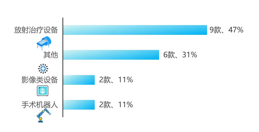 高端醫(yī)療裝備創(chuàng)新產(chǎn)品獲批共19款,放射性治療設(shè)備較去年增加,其中微創(chuàng)消融類裝備實現(xiàn)翻倍增加(從3增加到6),幫助腫瘤治療手術(shù)有效減輕患者痛苦并提升疾病治愈率。