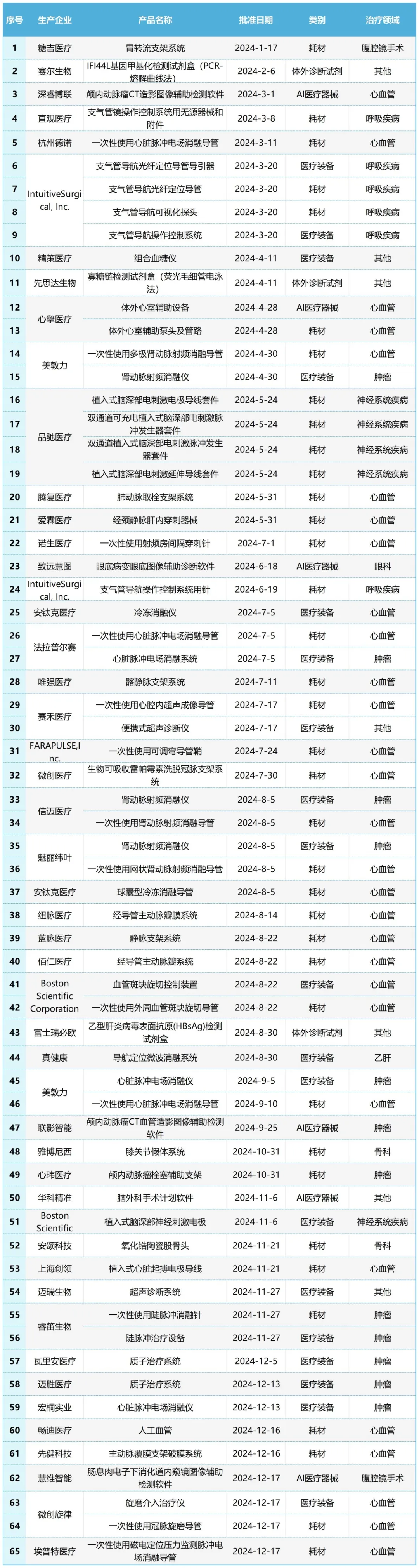 2024年,我國共有65款創(chuàng)新醫(yī)療器械獲得國家藥品監(jiān)督管理局(NMPA)批準(zhǔn)上市,獲批數(shù)量創(chuàng)歷史新高,總體來看國際化發(fā)展態(tài)勢不斷增強,區(qū)域集聚效能愈發(fā)顯著,多款運用國際首創(chuàng)技術(shù)的國內(nèi)首款產(chǎn)品接續(xù)發(fā)布,展現(xiàn)出強大的創(chuàng)新能力和高質(zhì)量發(fā)展趨勢。獲批產(chǎn)品具體特點如下: