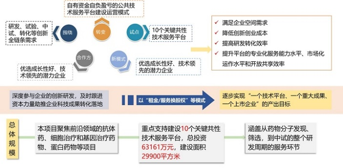 圍繞研發(fā)、試驗、中試、轉(zhuǎn)化等創(chuàng)新全鏈條需求,通過“活機(jī)制、強(qiáng)支持、促協(xié)同”的支持手段,建設(shè)生命科學(xué)園關(guān)鍵共性技術(shù)服務(wù)平臺,采用園區(qū)提供場地并主導(dǎo)投資建設(shè)、合作企業(yè)租用運(yùn)營的模式進(jìn)行推進(jìn),探索以“租金/服務(wù)換股權(quán)”等模式,深度參與企業(yè)的創(chuàng)新研發(fā),及時跟進(jìn)資本力量助推企業(yè)科技成果轉(zhuǎn)化落地,逐步實現(xiàn)“一個技術(shù)平臺、一個重大成果、一個上市企業(yè)”的產(chǎn)出目標(biāo),實現(xiàn)園區(qū)平臺與入駐企業(yè)共享共創(chuàng)共贏的發(fā)展模式,助力北京建設(shè)國際科技創(chuàng)新中心和成為擁有國際影響力的生物醫(yī)藥自主創(chuàng)新主陣地。